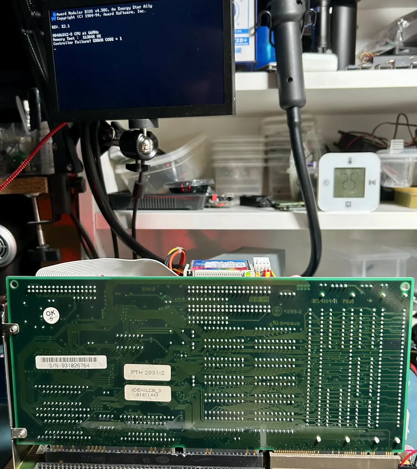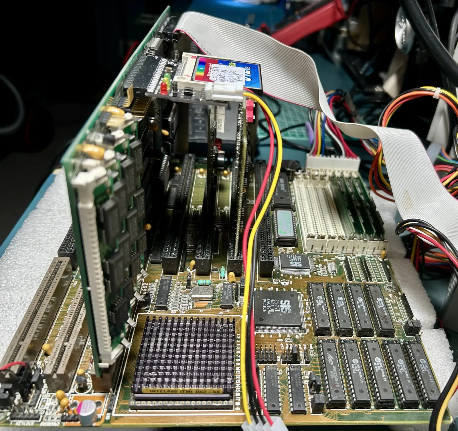 * platforma testowa taka sama jak przy 3 poprzednich vlb 2x s3 805 vlb i currus 5429: i486dx2/66, ram 4x4MB 60ns, mobo na sis 471 z 3 slotami vlb, cache l2 off bo sial bledami, dysk cf 512MB, podlaczona karta post oraz klawiatura, poprzednia multi io na isa wyjeta i wlozona biezaca