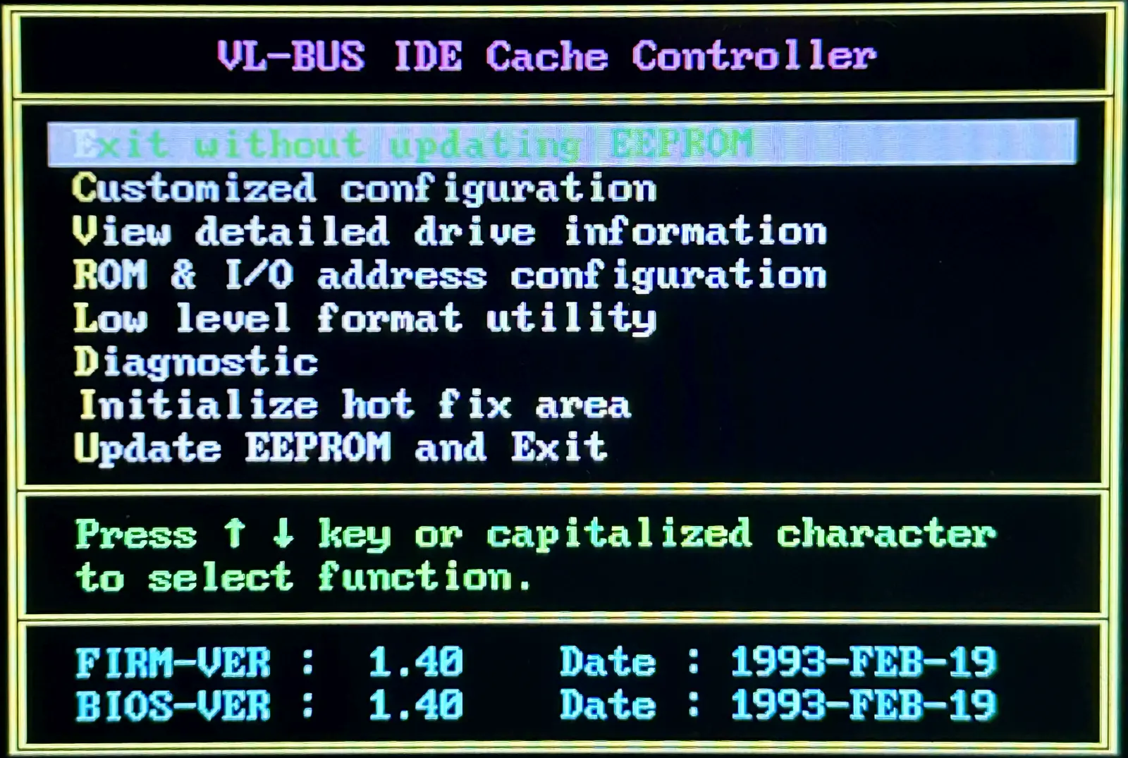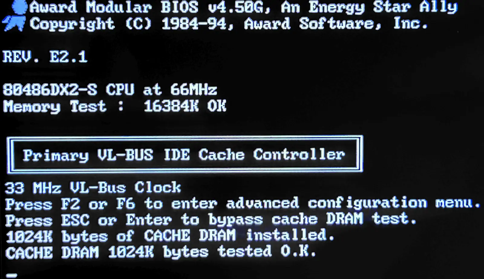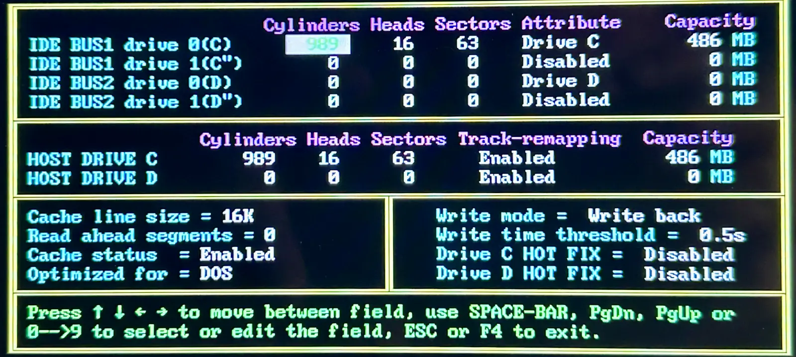 * wsadzone 4 moduly simm i... zglosil sie kontroler, wyswietla poprawna ilosc pamieci cache 1MB, mozna wejsc do ustawien zaawansowanych, dysk cf wykryty, fdd wlaczona, konfig zapisany - warto pozniej w bios plyty wlaczyc shadow-ram na adres dc00, tam jest rom kontrolera i jego kopia w ram na pewno przyspieszy dzialanie