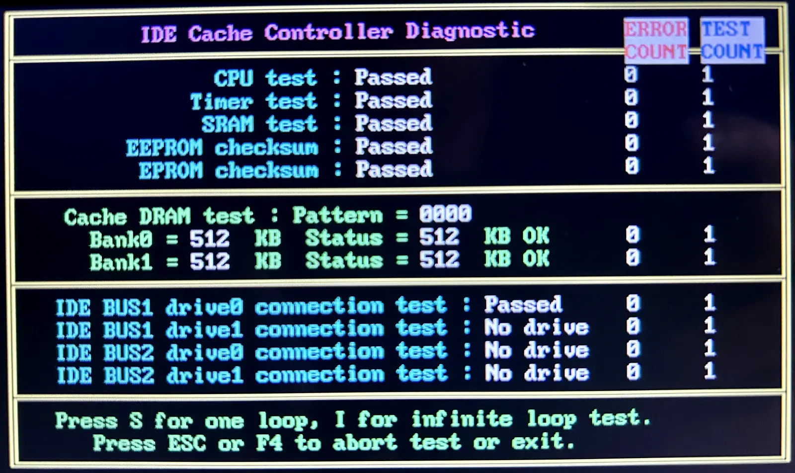 * bios kontrolera zawiera rowniez diagnostyke dla cache, test zaliczony bez bledow