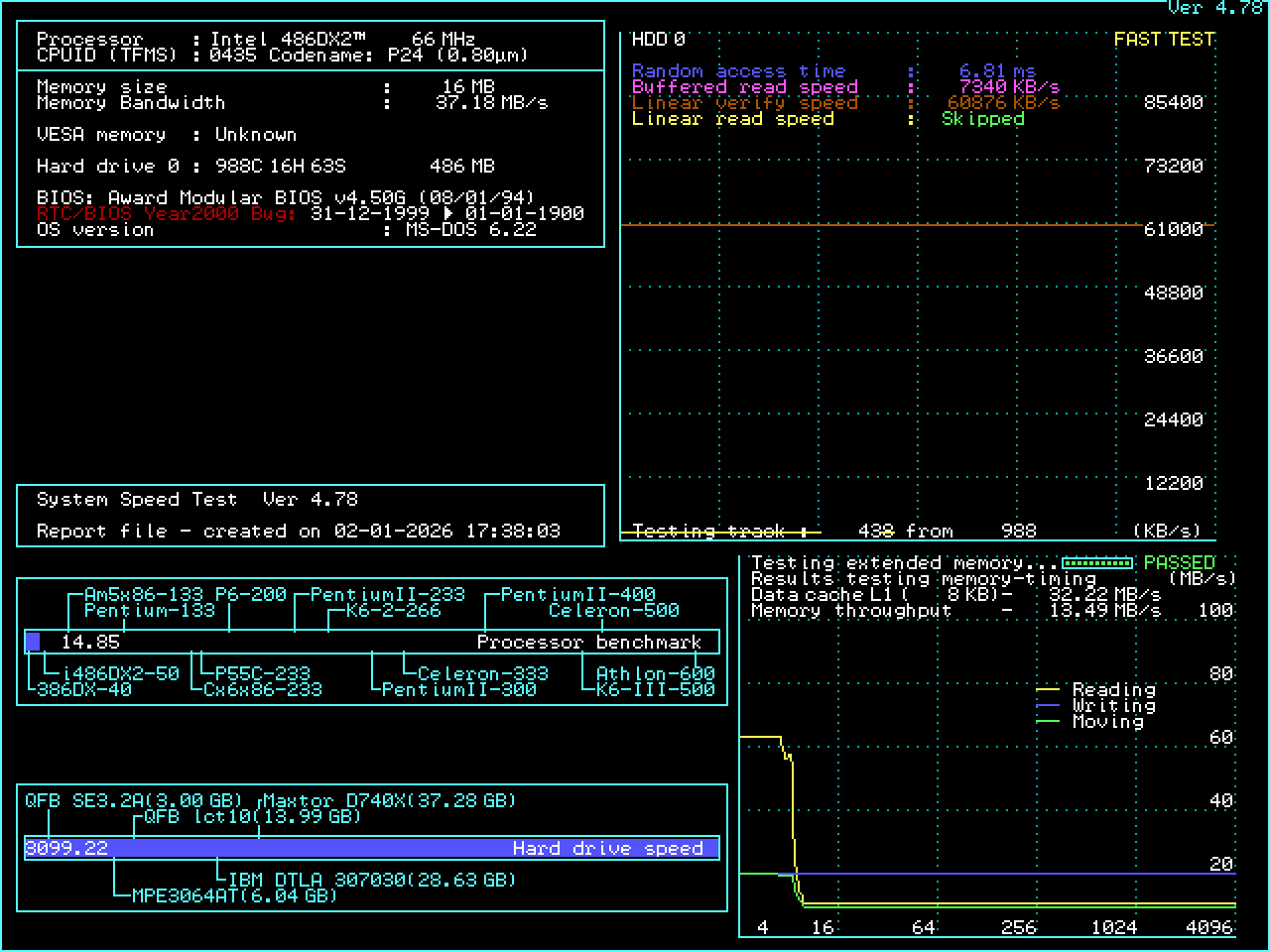 * szybki test dysku cf w checkit daje 4MB/s, speedsys zglasza ponad 7MB/s w trybie buforowanym, boot z dyskietki rowniez dziala, jako testowa stacja byl uzyty gotek i obraz dos5