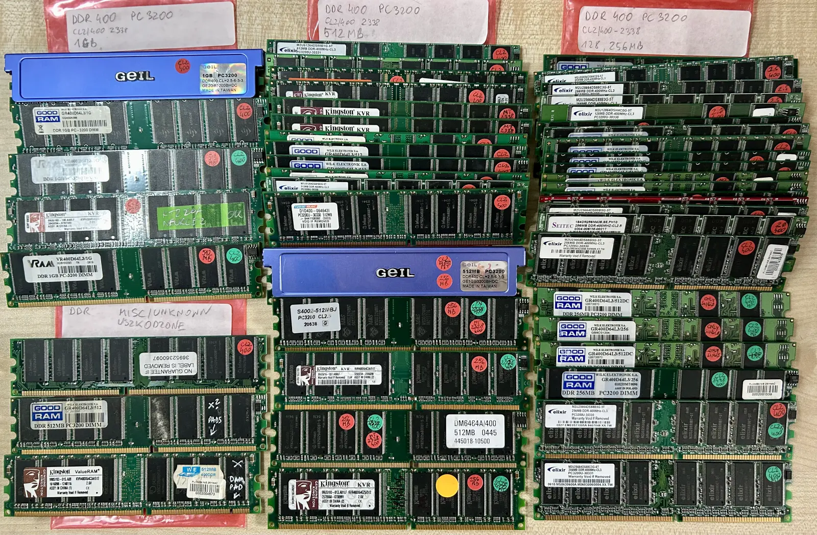 * w pudle z pamieciami, znalazlo sie ~50 sztuk ddr400, kazda byla przetestowana czy dziala, tzn. czy przechodzi post a nastepnie przetestowana z najszybszymi taktami jakie oferuje plyta, czyli 2-3-3-8 (CAS/CL-TRCD-TRP-TRAS), po tej selekcji zostalo kilka modulow ktore udalo sie jeszcze minimalnie pogonic na 2-3-2-8, zmiana 2 taktu TRCD 3->2 powodowala zawsze problem z detekcja ram przy post i zaden z modulow nie dal rady, zas ostatni TRAS okazal sie byc szybsza opcja jako 8 niz 6, to ciekawe ale test nie klamie, predkosc pamieci byla mierzona w memtest86+ v5.31b, dokladne zapiski na zdjeciu
